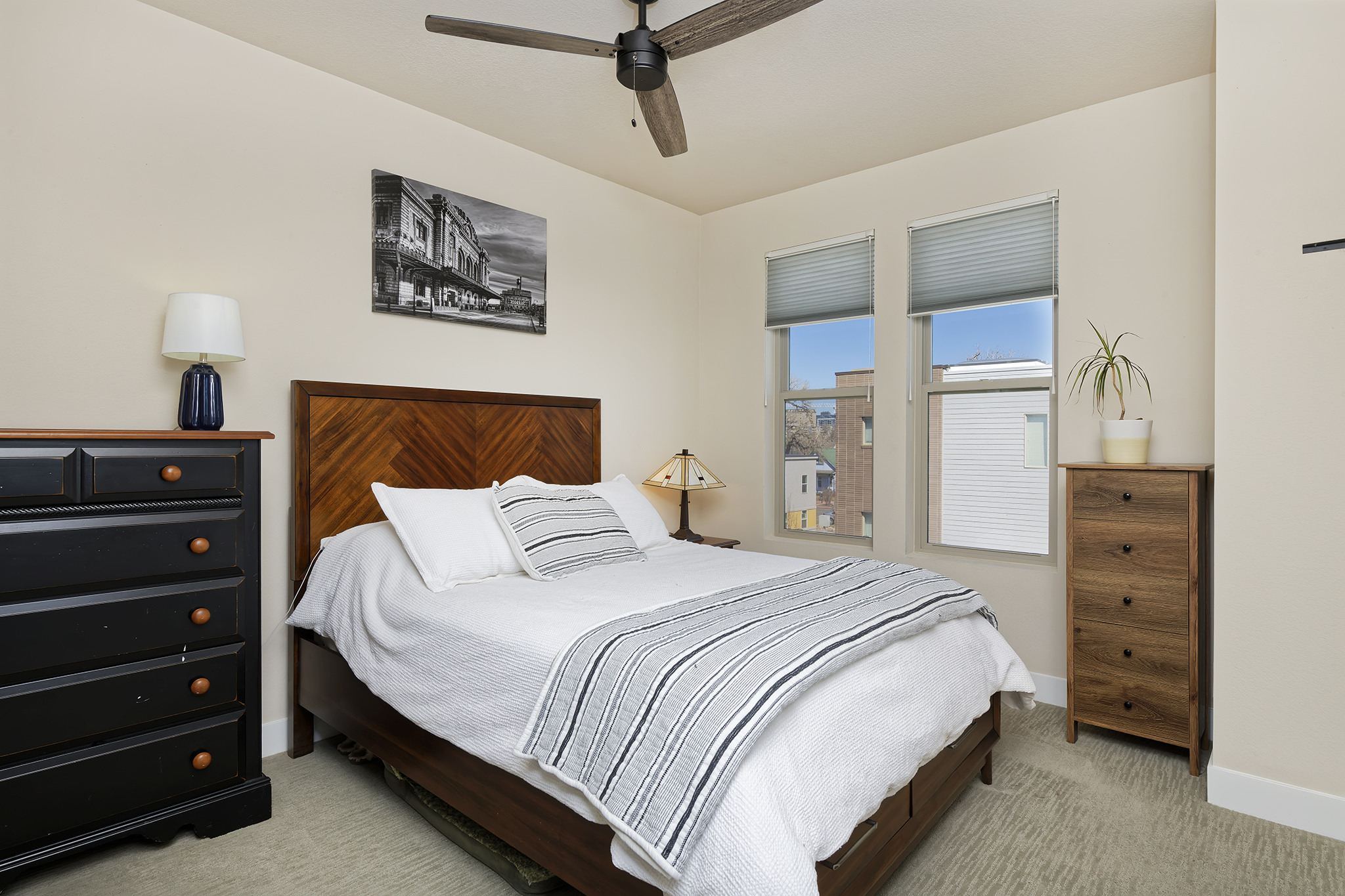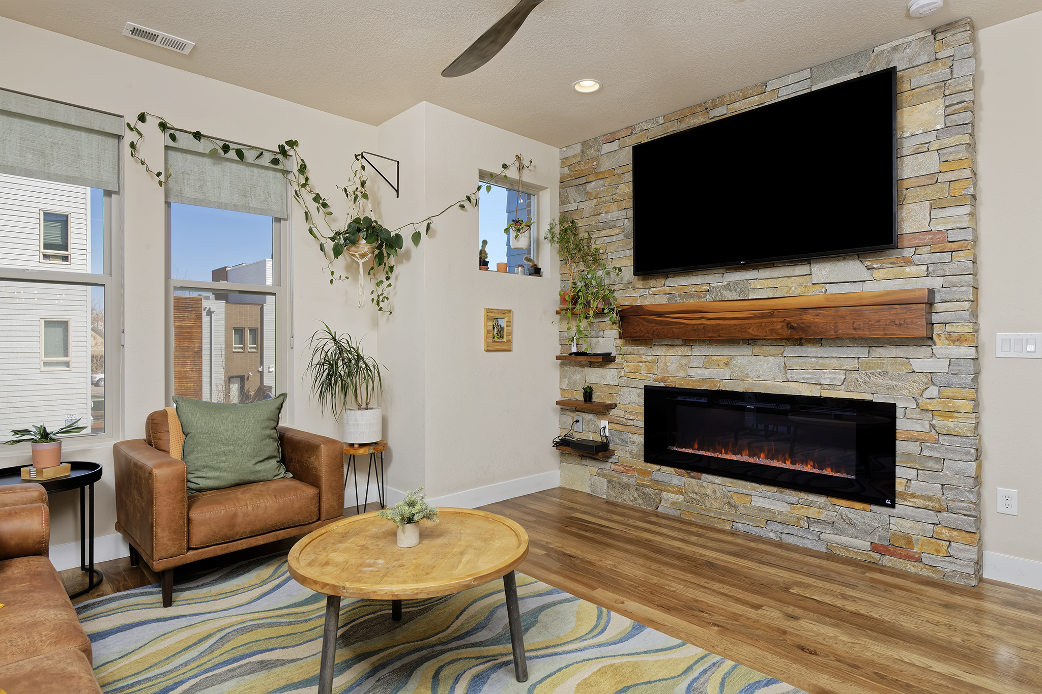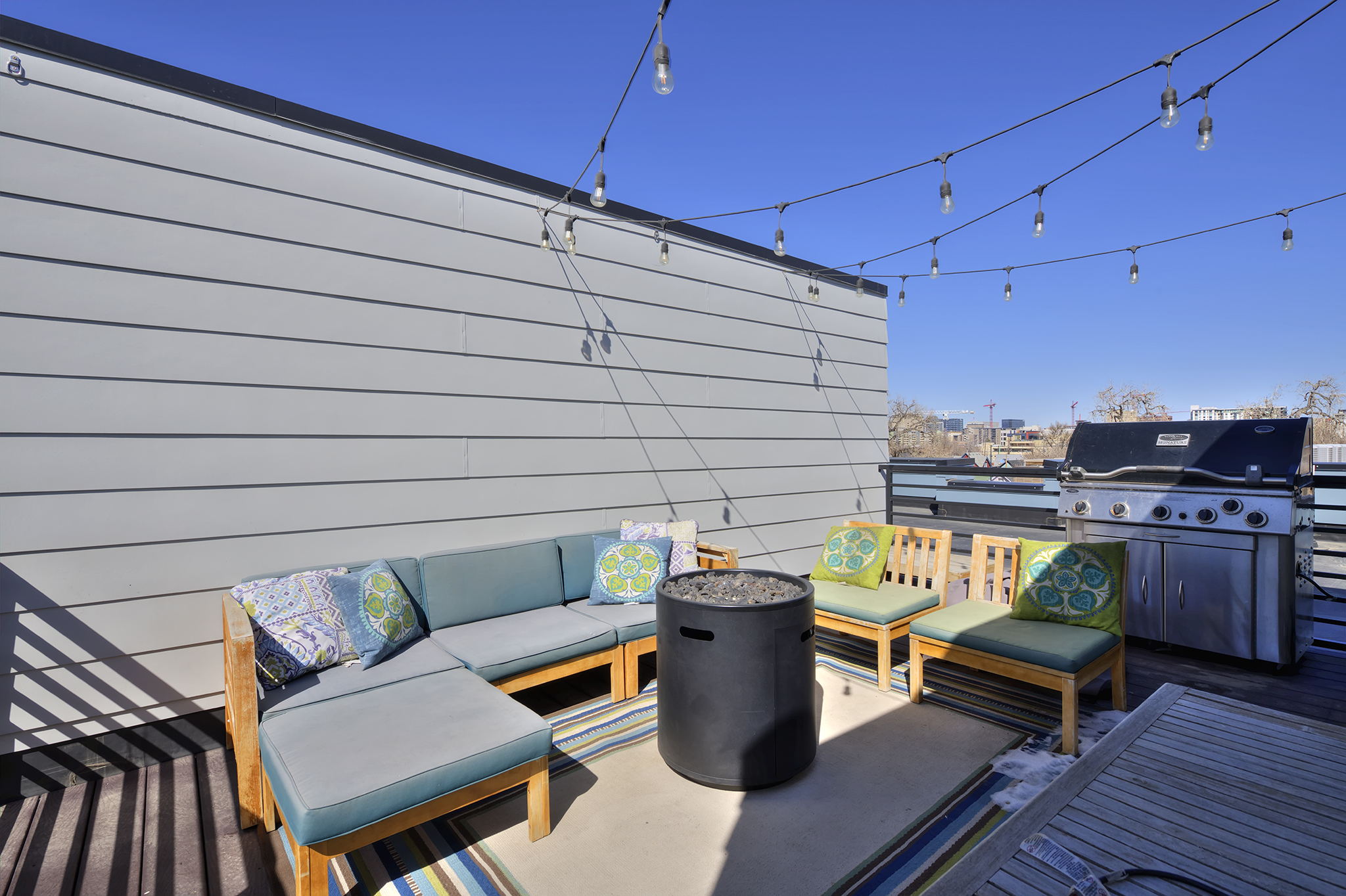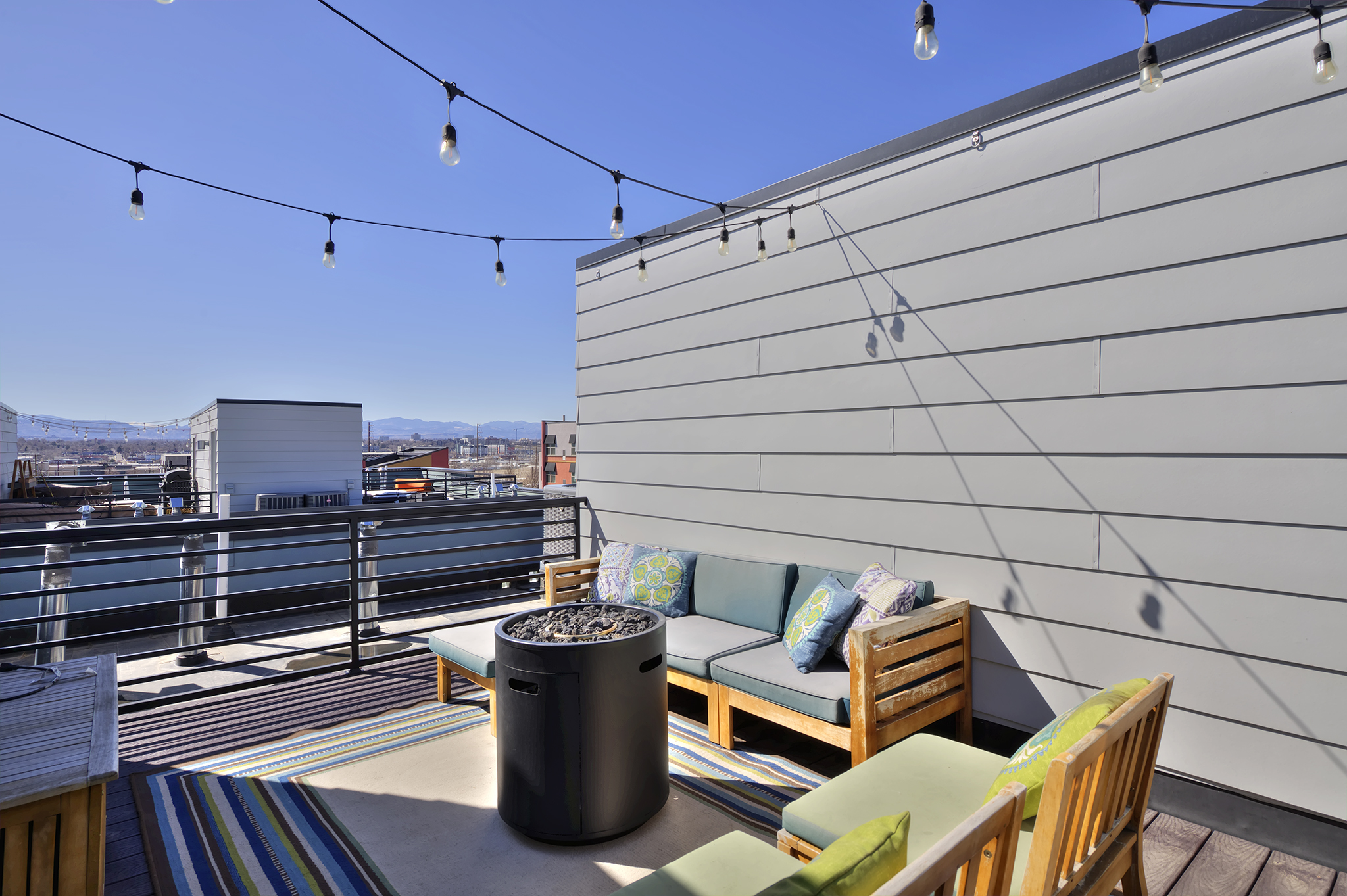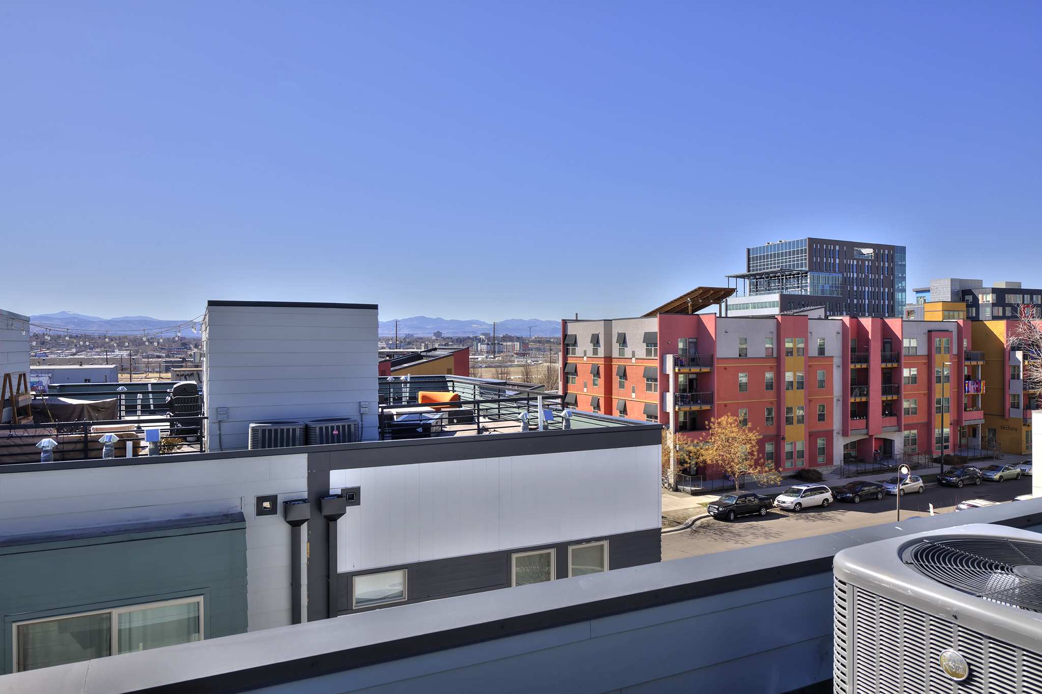 The lyrics to “Up on the Roof” are going to be playing in your head on repeat once you discover this home’s sunny and spectacular rooftop patio with views of the mountains during the day and city lights in the evening. Hook up your grill to the rooftop gas line and you’ll be the host to envy, with scenic summer cookouts all season long. Inside this contemporary, impeccably finished home are four levels of gorgeous spaces. The main floor has a convenient attached garage, a bedroom that can also be used as a study or office, and a great bathroom—all with tile floors throughout. On the second level is a stylish kitchen with granite counters, richly grained dark-wood cabinetry, and stainless appliances. Incredible ¾-inch hardwood hickory flooring run through this entire level, which flows easily from the kitchen into the living room, where a custom stone feature wall surrounds a fireplace and wood mantle. Upstairs is your peaceful primary suite and another bedroom with an en suite bath—the perfect place for rest, and just seconds from your refreshing panoramic rooftop. Just over a mile from the performing arts center and LoDo and two blocks from the 10th and Osage light rail station, Denver is your oyster from this beautiful townhouse.