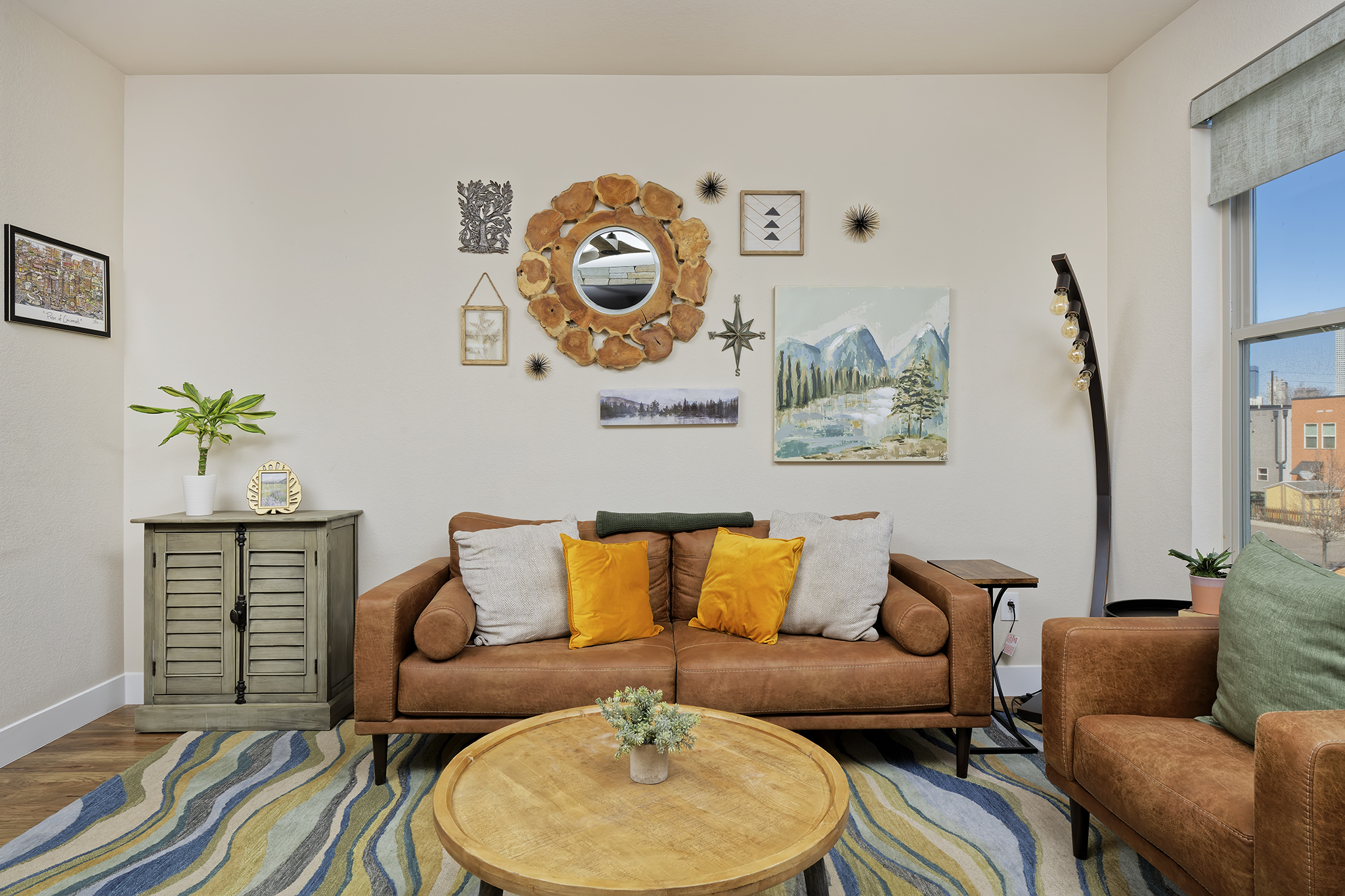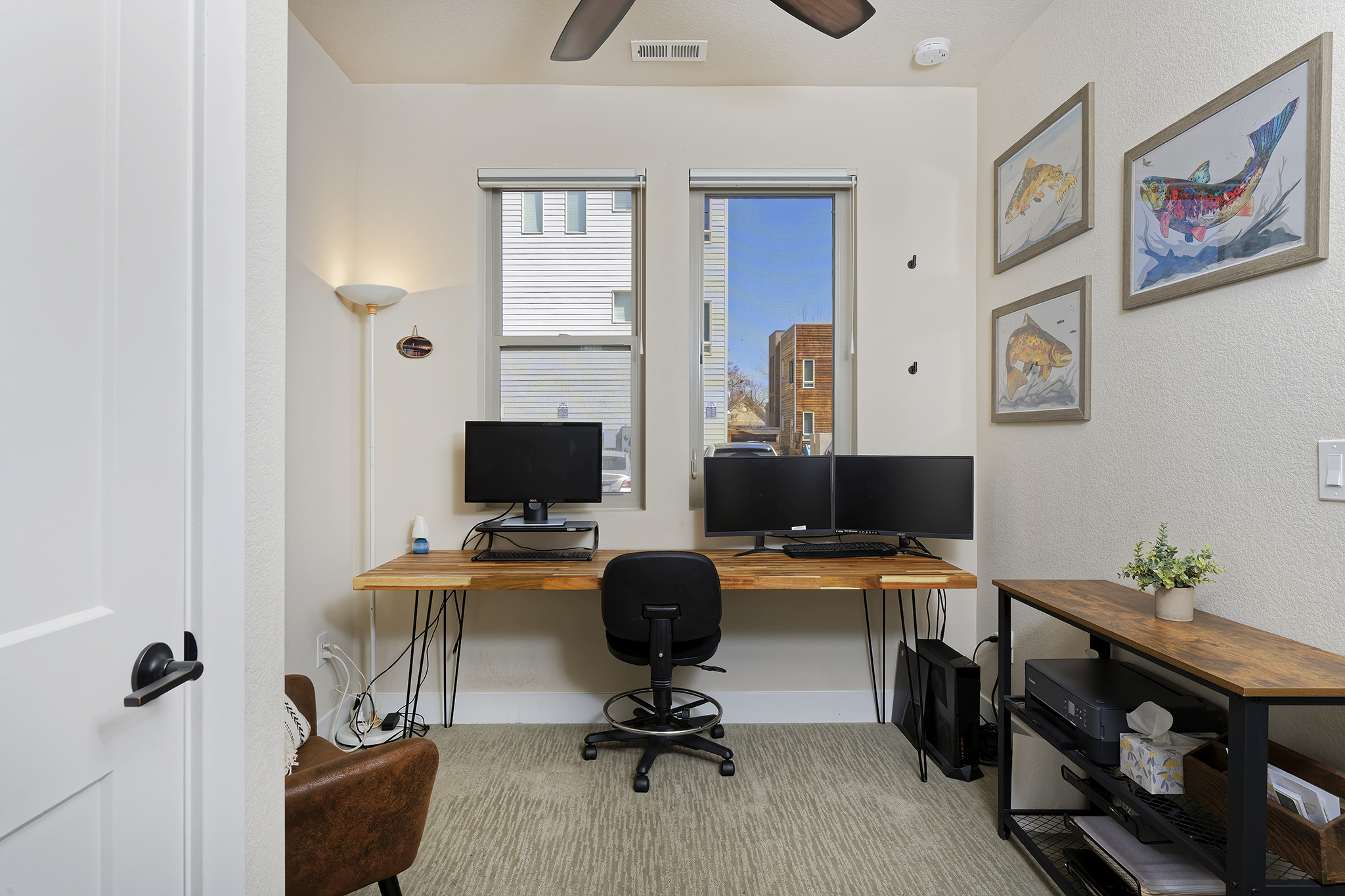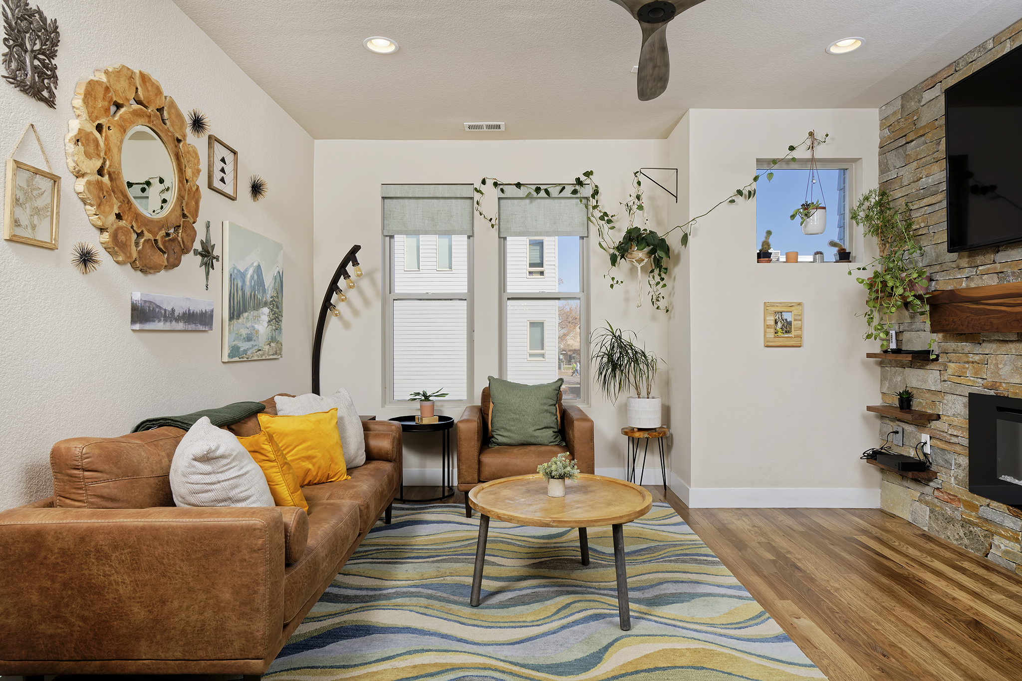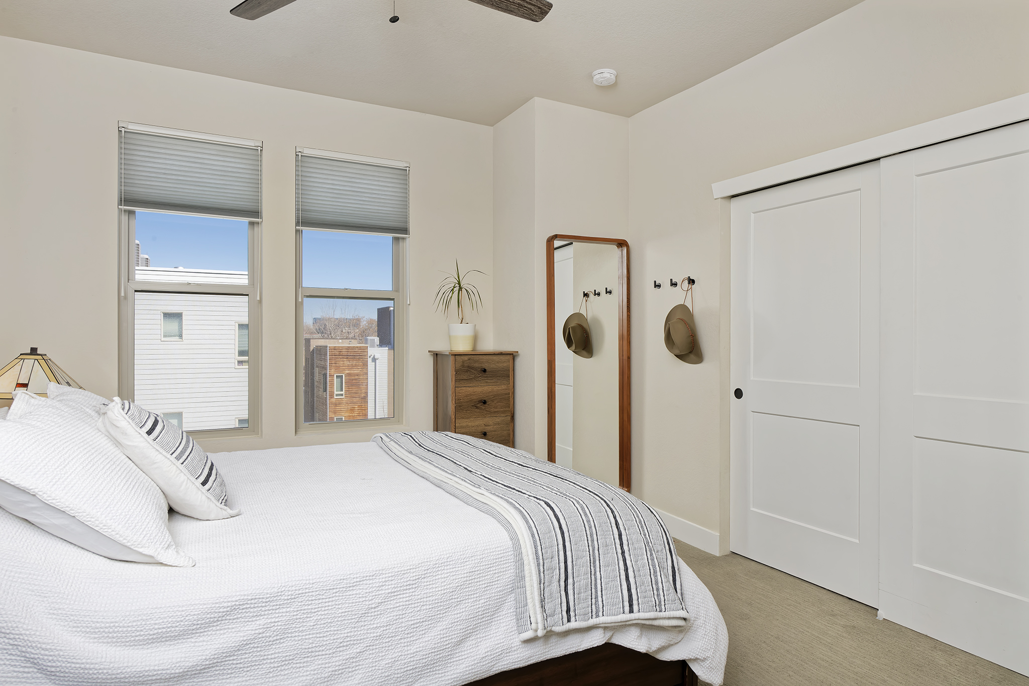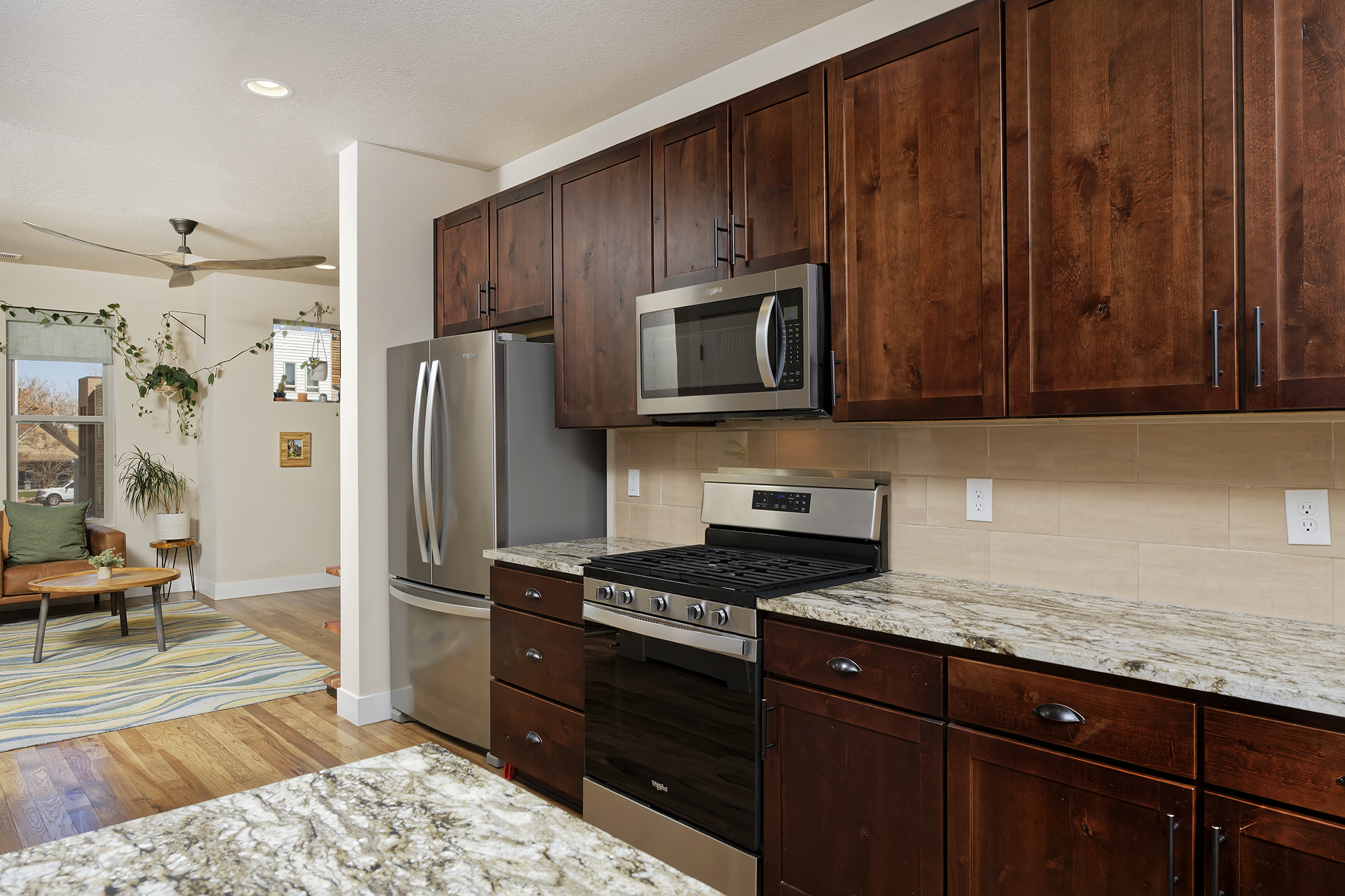 The lyrics to “Up on the Roof” are going to be playing in your head on repeat once you discover this home’s sunny and spectacular rooftop patio with views of the mountains during the day and city lights in the evening. Hook up your grill to the rooftop gas line and you’ll be the host to envy, with scenic summer cookouts all season long. Inside this contemporary, impeccably finished home are four levels of gorgeous spaces. The main floor has a convenient attached garage, a bedroom that can also be used as a study or office, and a great bathroom—all with tile floors throughout. On the second level is a stylish kitchen with granite counters, richly grained dark-wood cabinetry, and stainless appliances. Incredible ¾-inch hardwood hickory flooring run through this entire level, which flows easily from the kitchen into the living room, where a custom stone feature wall surrounds a fireplace and wood mantle. Upstairs is your peaceful primary suite and another bedroom with an en suite bath—the perfect place for rest, and just seconds from your refreshing panoramic rooftop. Just over a mile from the performing arts center and LoDo and two blocks from the 10th and Osage light rail station, Denver is your oyster from this beautiful townhouse.