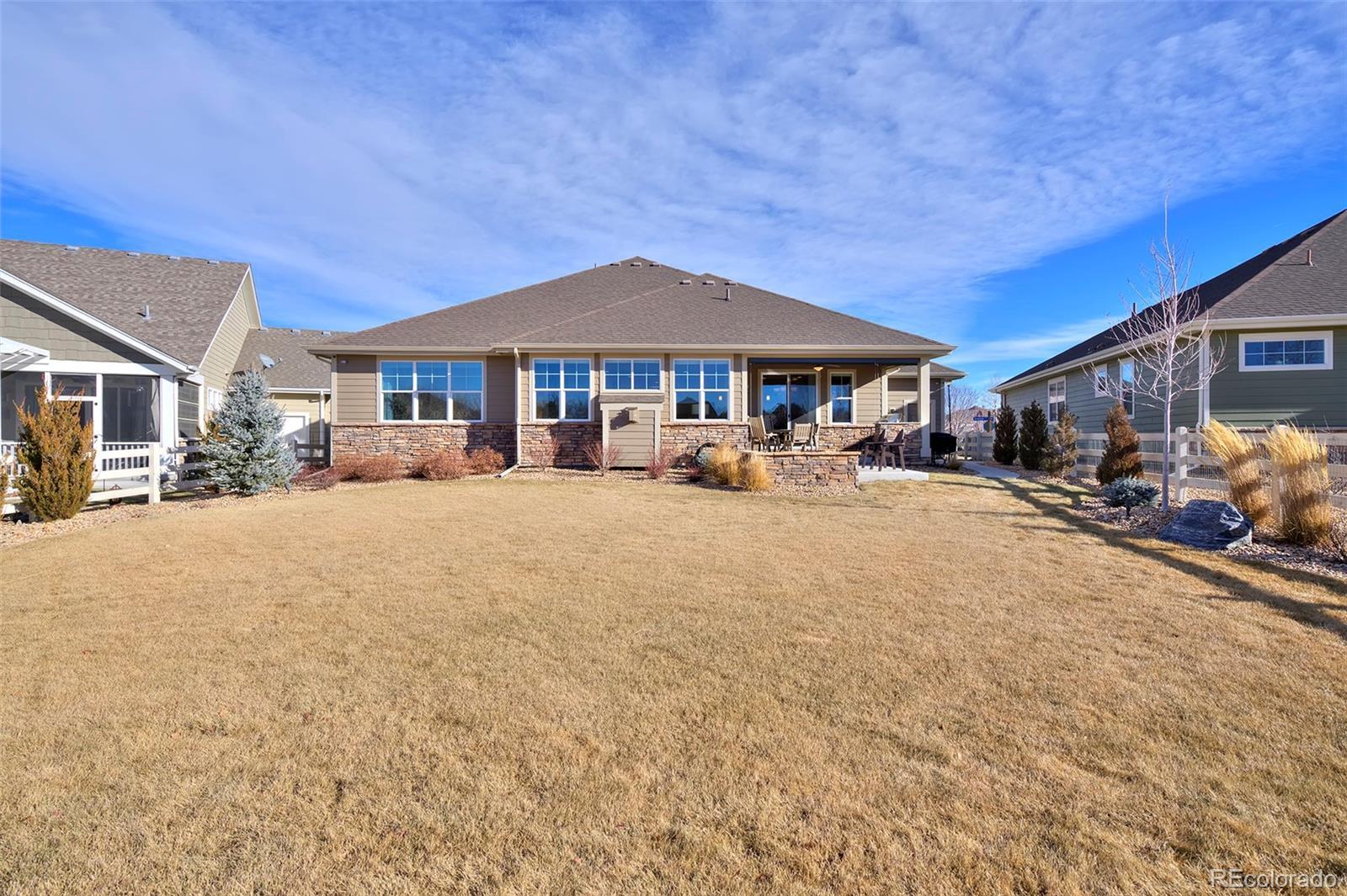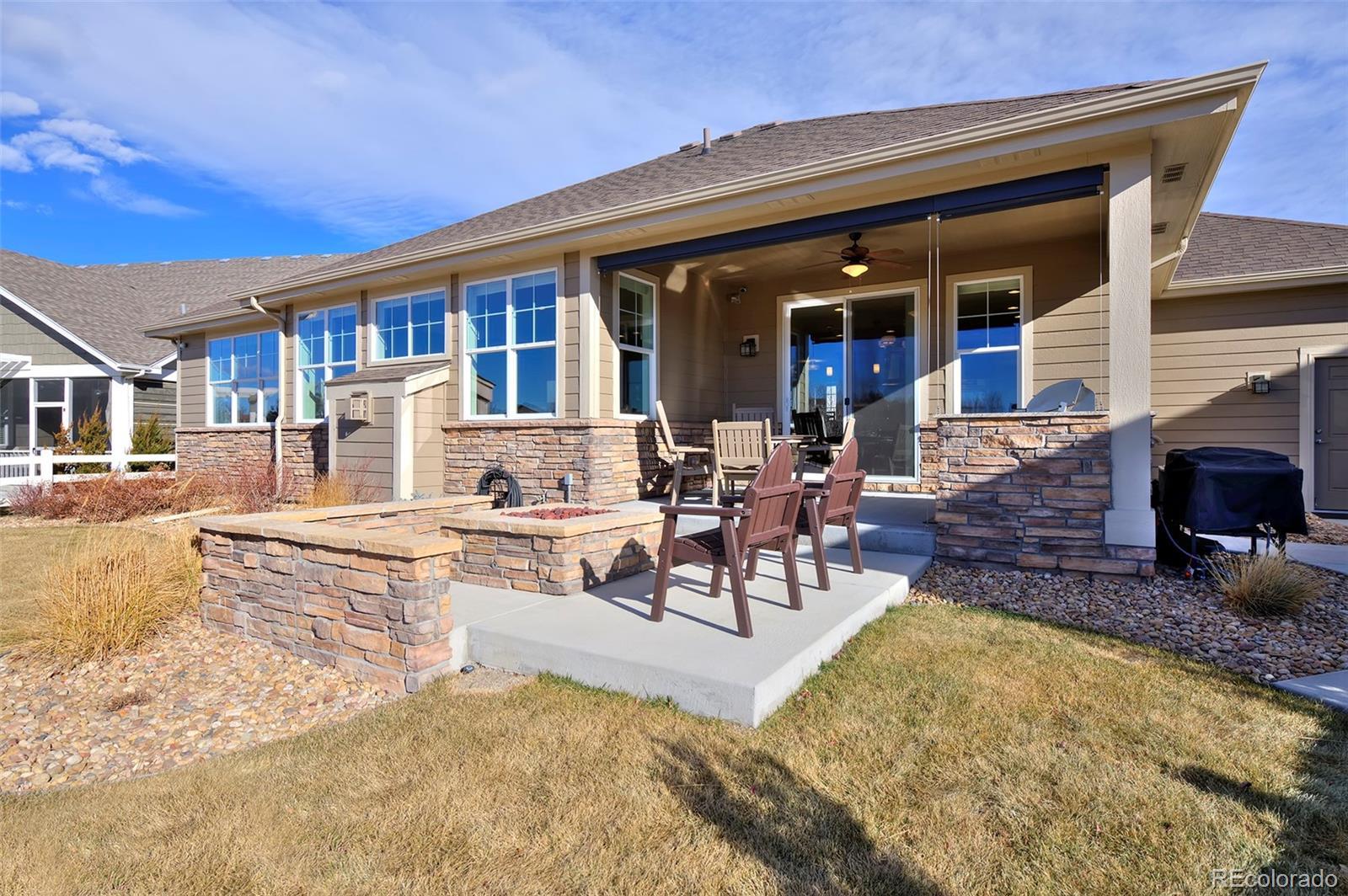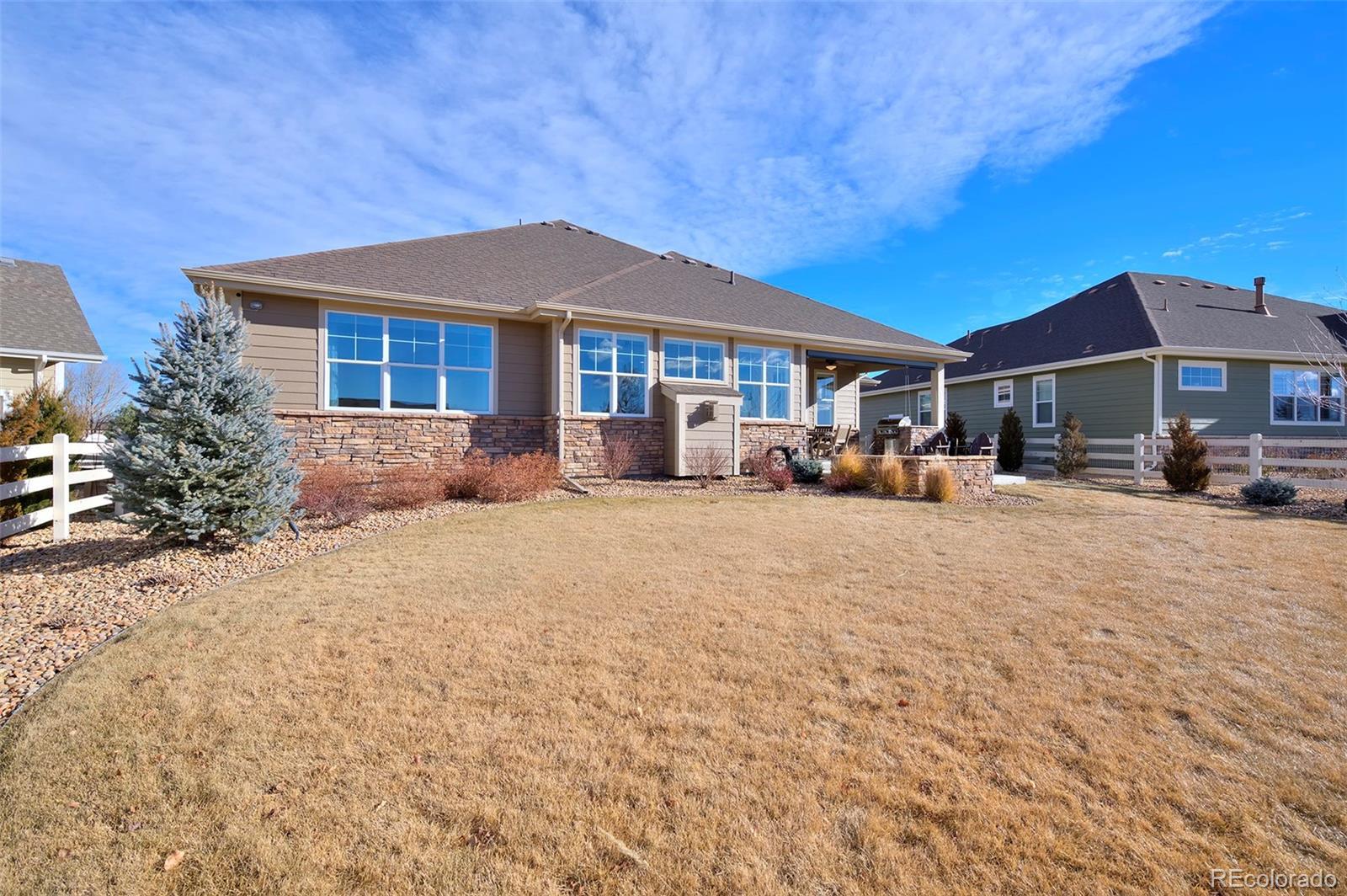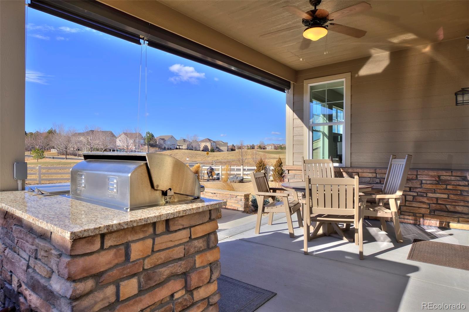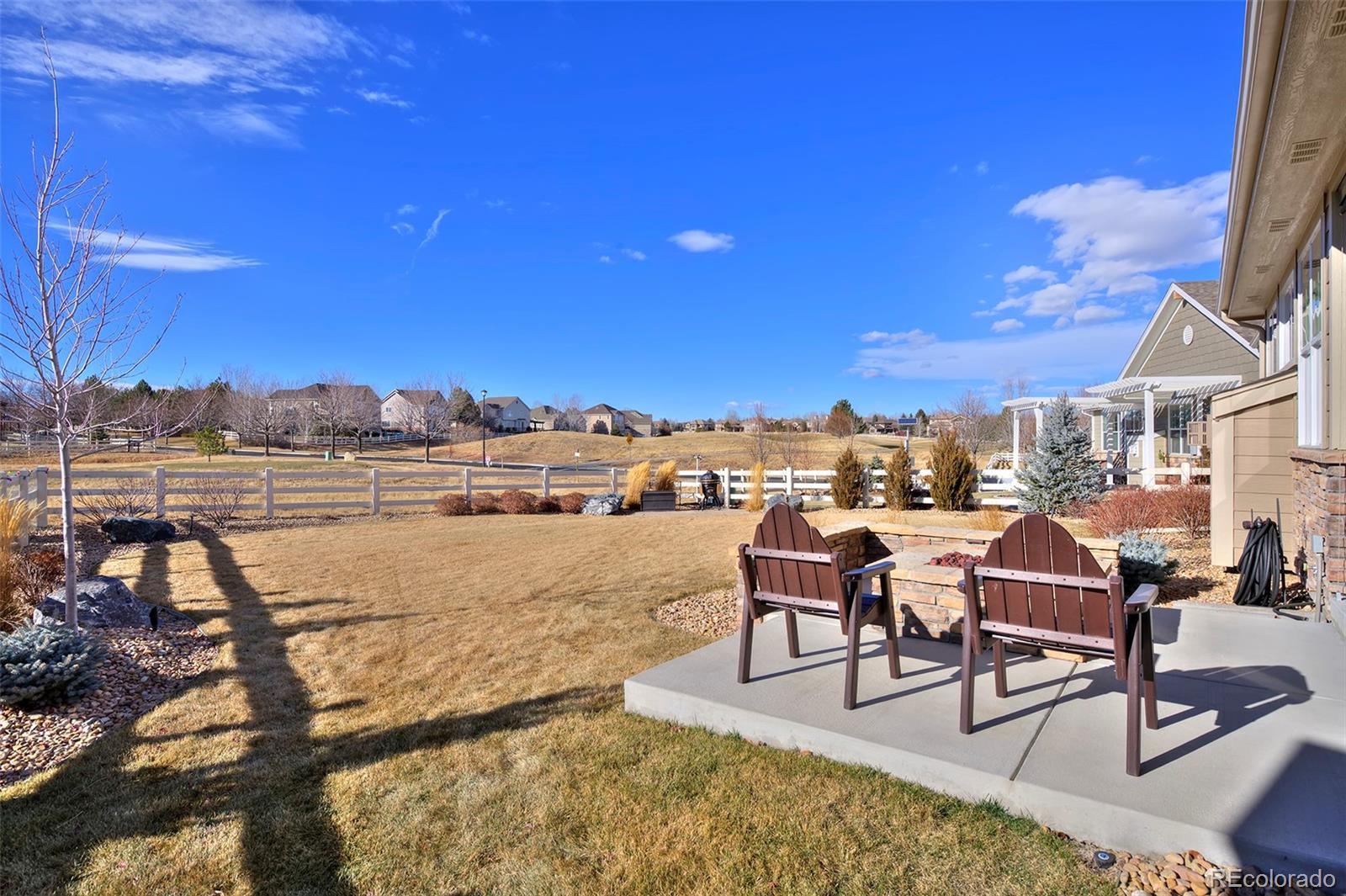 This home is bound to cause a little stomach flip each time you turn the corner and head up your driveway. It's just that perfect. Built in 2018 and immaculate to this day, it backs to Broadlands Golf Course and is moments from the Broomfield Commons open spaces, sports fields and parks. A sweeping, open and bright floor plan is outfitted with beautiful wood floors, custom cabinetry, quartz counters and Bosch appliances while recent upgrades have added a built-in entertainment cabinet in the family room, high-end interior window coverings, and 3 individually controlled climate zones for whole-house comfort. Outside is pristine, lighted landscaping with full irrigation and drip systems; security cameras; a gorgeous patio with sunshades; and a built-in outdoor kitchen and fire pit for wow-worthy entertaining. A 4-car garage with granite epoxy flooring has tons of storage and a workspace with cabinets. This is luxe, single-level living at its best with neighborhood and mountain views to boot.