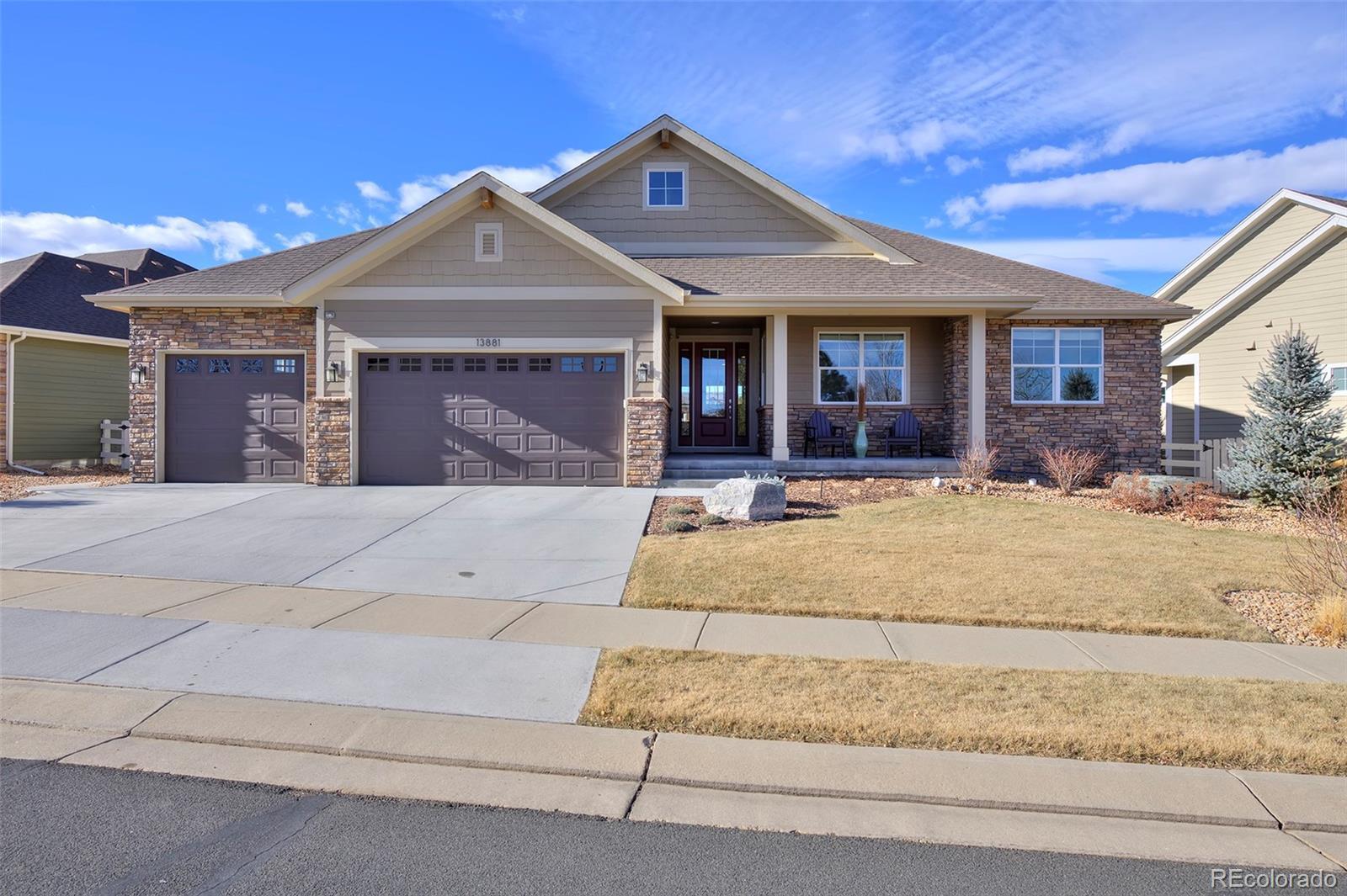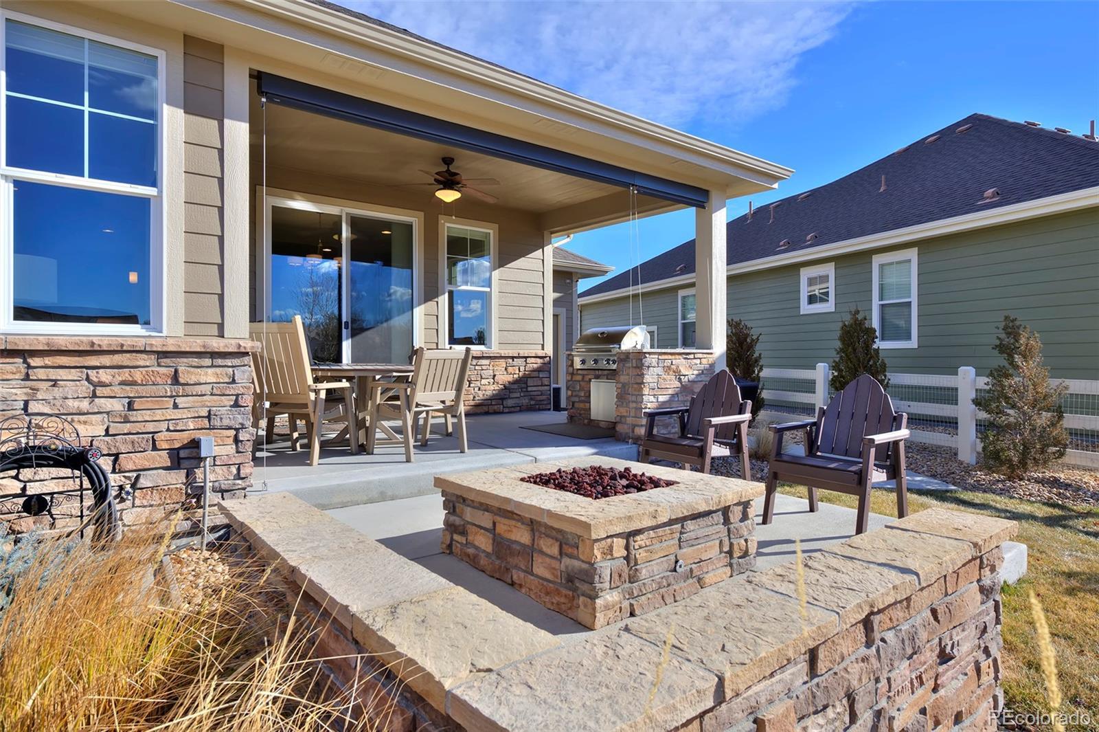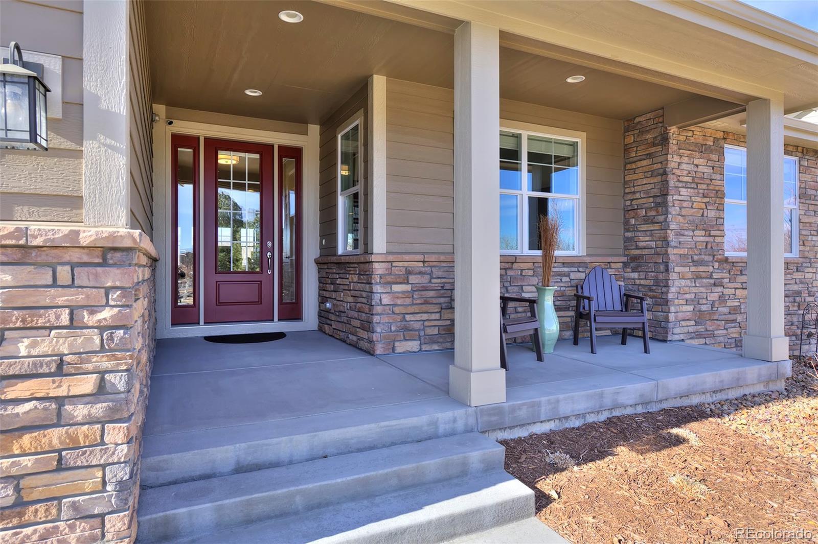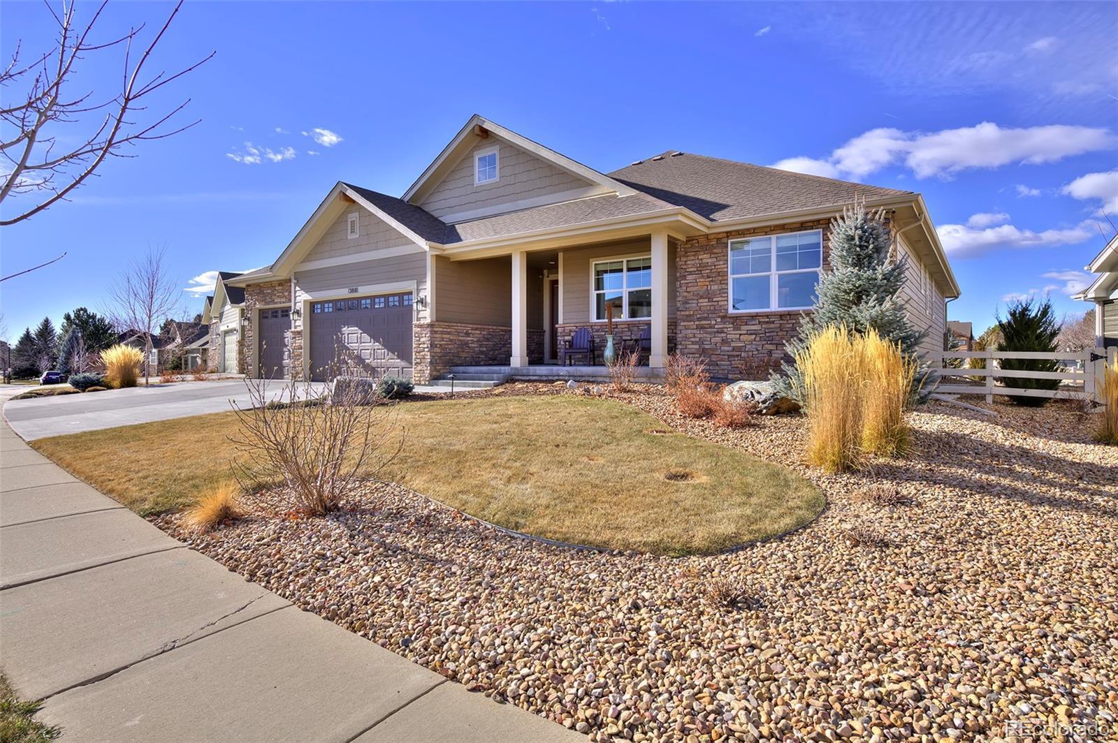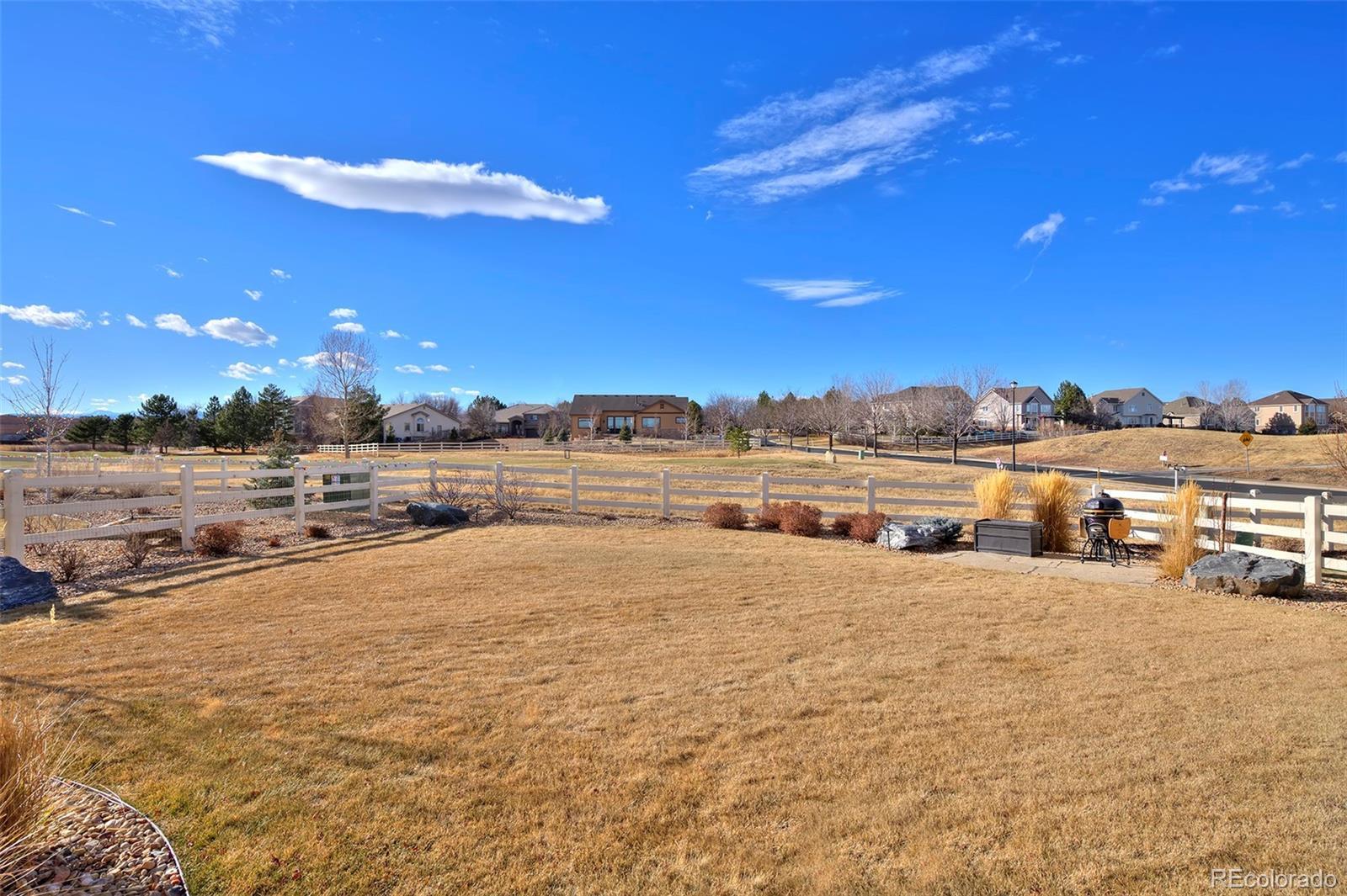 This home is bound to cause a little stomach flip each time you turn the corner and head up your driveway. It's just that perfect. Built in 2018 and immaculate to this day, it backs to Broadlands Golf Course and is moments from the Broomfield Commons open spaces, sports fields and parks. A sweeping, open and bright floor plan is outfitted with beautiful wood floors, custom cabinetry, quartz counters and Bosch appliances while recent upgrades have added a built-in entertainment cabinet in the family room, high-end interior window coverings, and 3 individually controlled climate zones for whole-house comfort. Outside is pristine, lighted landscaping with full irrigation and drip systems; security cameras; a gorgeous patio with sunshades; and a built-in outdoor kitchen and fire pit for wow-worthy entertaining. A 4-car garage with granite epoxy flooring has tons of storage and a workspace with cabinets. This is luxe, single-level living at its best with neighborhood and mountain views to boot.