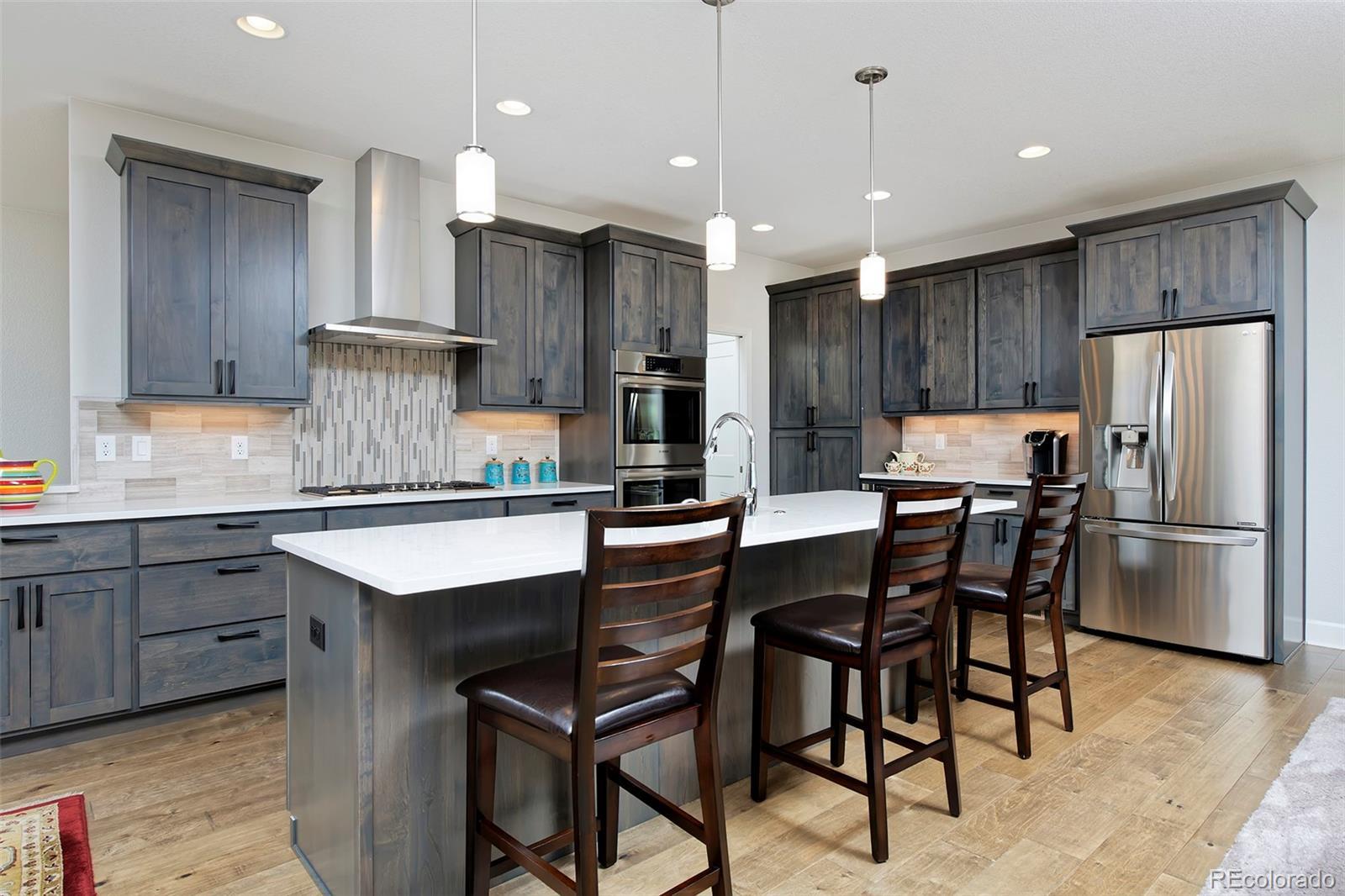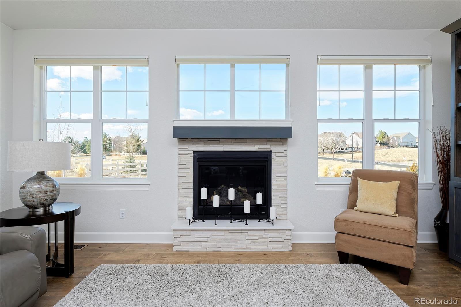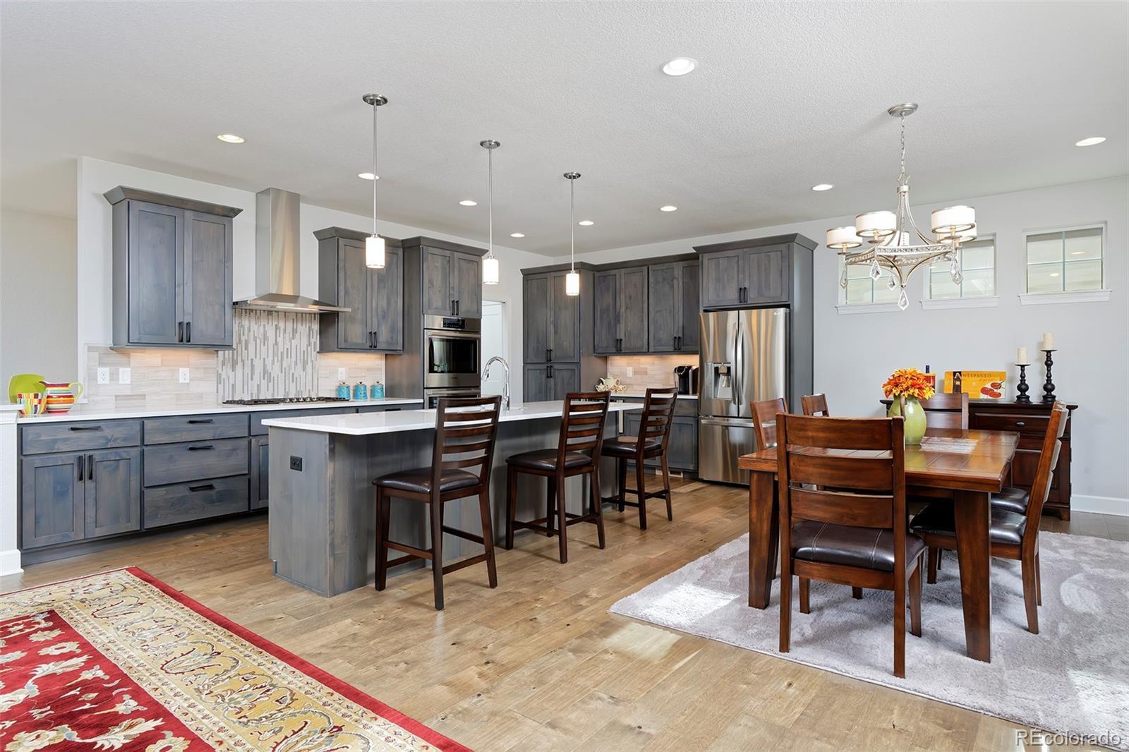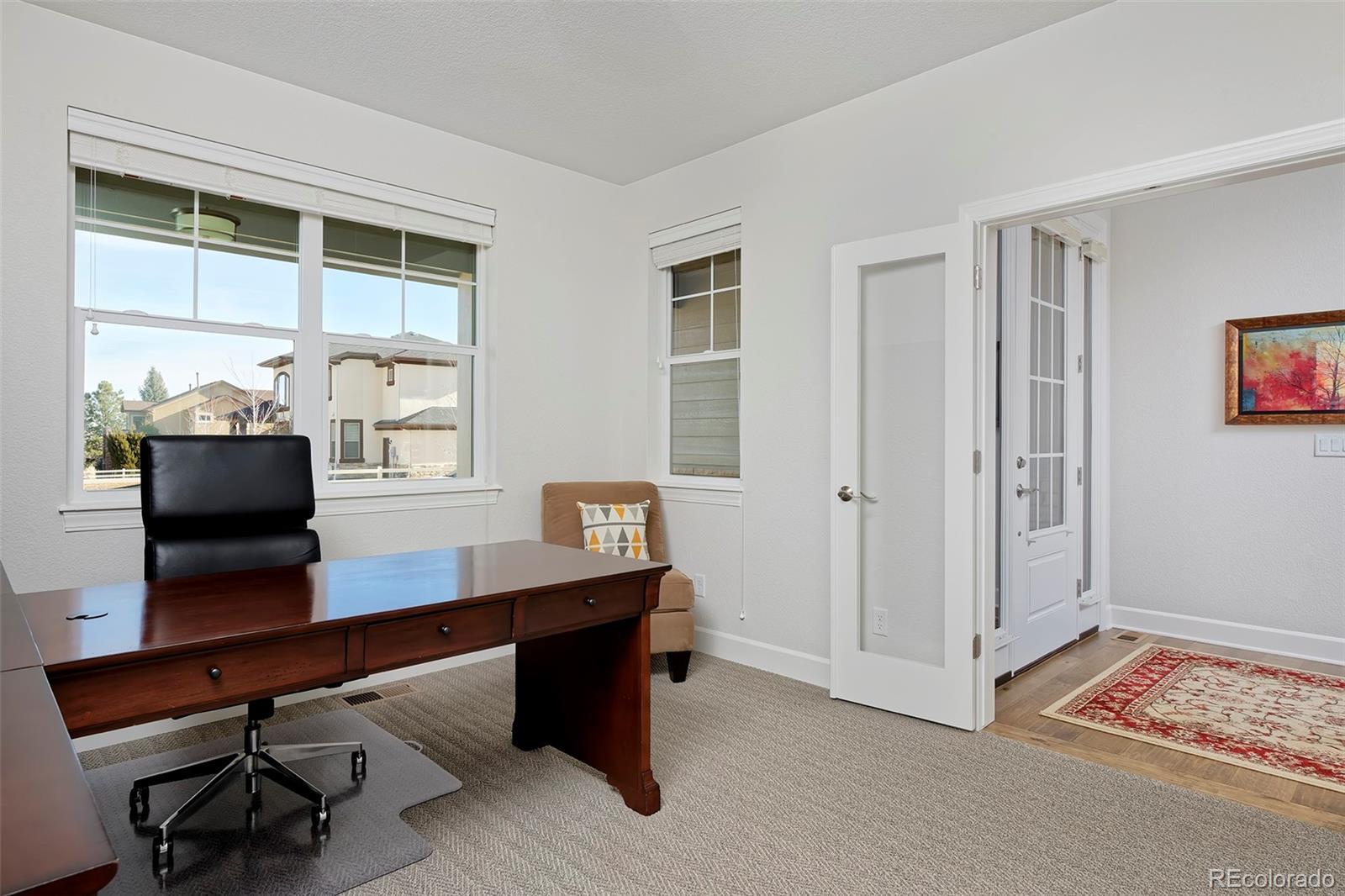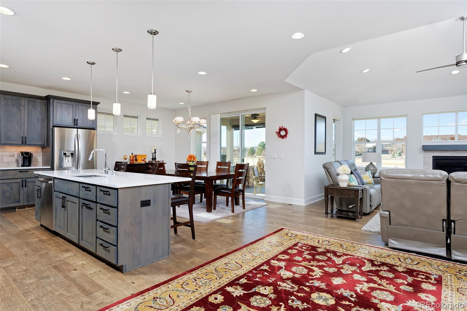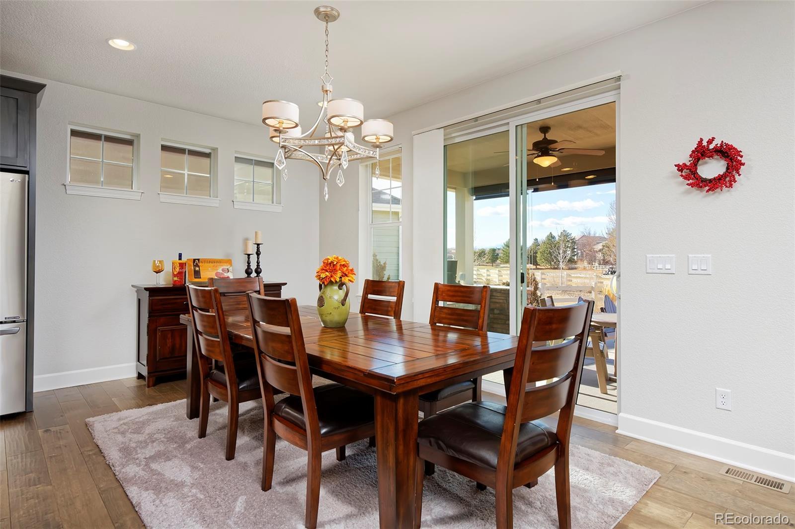 This home is bound to cause a little stomach flip each time you turn the corner and head up your driveway. It's just that perfect. Built in 2018 and immaculate to this day, it backs to Broadlands Golf Course and is moments from the Broomfield Commons open spaces, sports fields and parks. A sweeping, open and bright floor plan is outfitted with beautiful wood floors, custom cabinetry, quartz counters and Bosch appliances while recent upgrades have added a built-in entertainment cabinet in the family room, high-end interior window coverings, and 3 individually controlled climate zones for whole-house comfort. Outside is pristine, lighted landscaping with full irrigation and drip systems; security cameras; a gorgeous patio with sunshades; and a built-in outdoor kitchen and fire pit for wow-worthy entertaining. A 4-car garage with granite epoxy flooring has tons of storage and a workspace with cabinets. This is luxe, single-level living at its best with neighborhood and mountain views to boot.