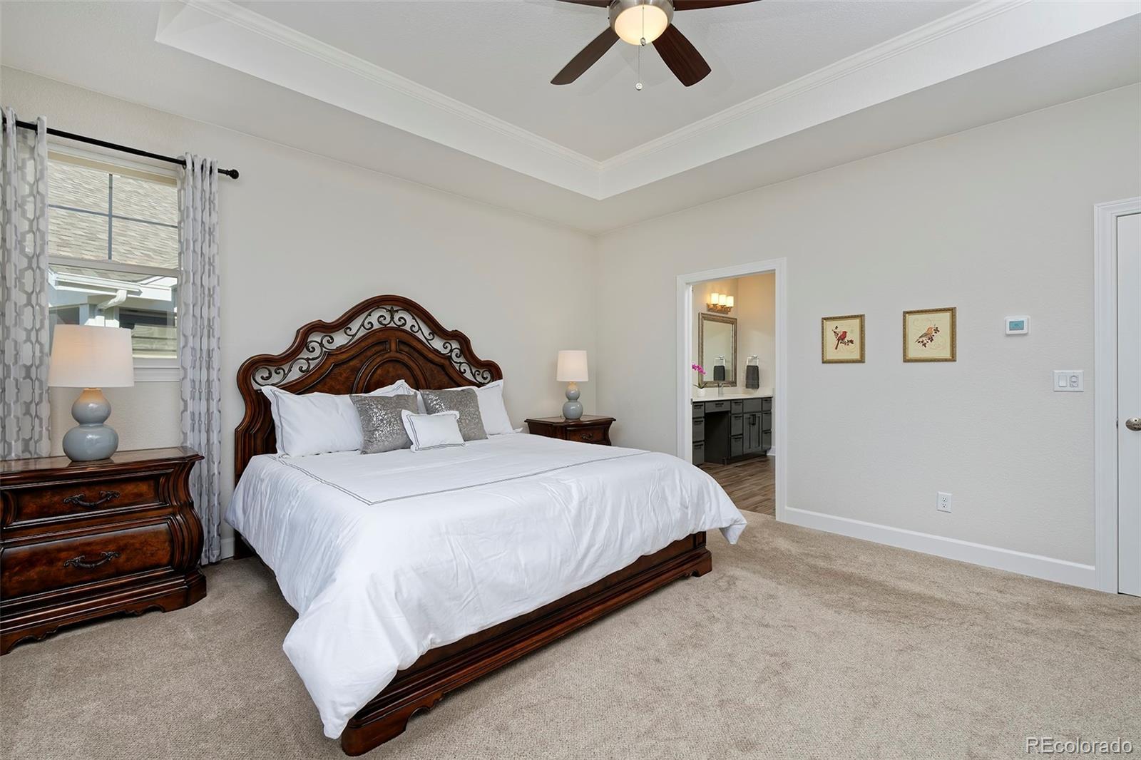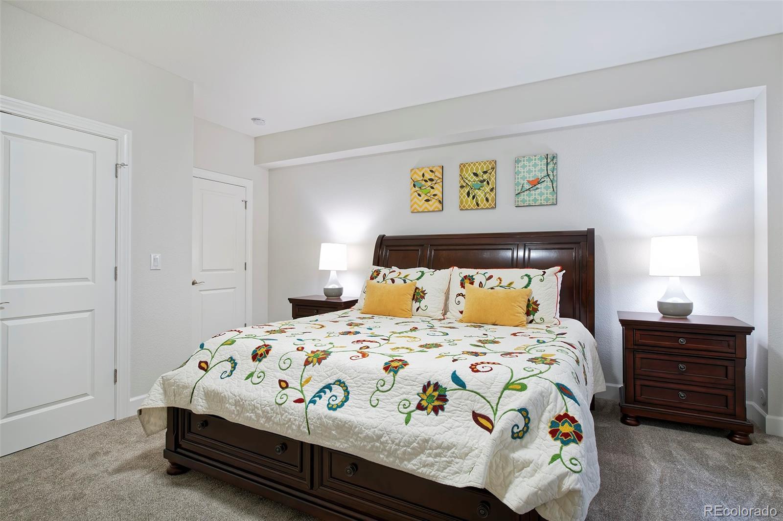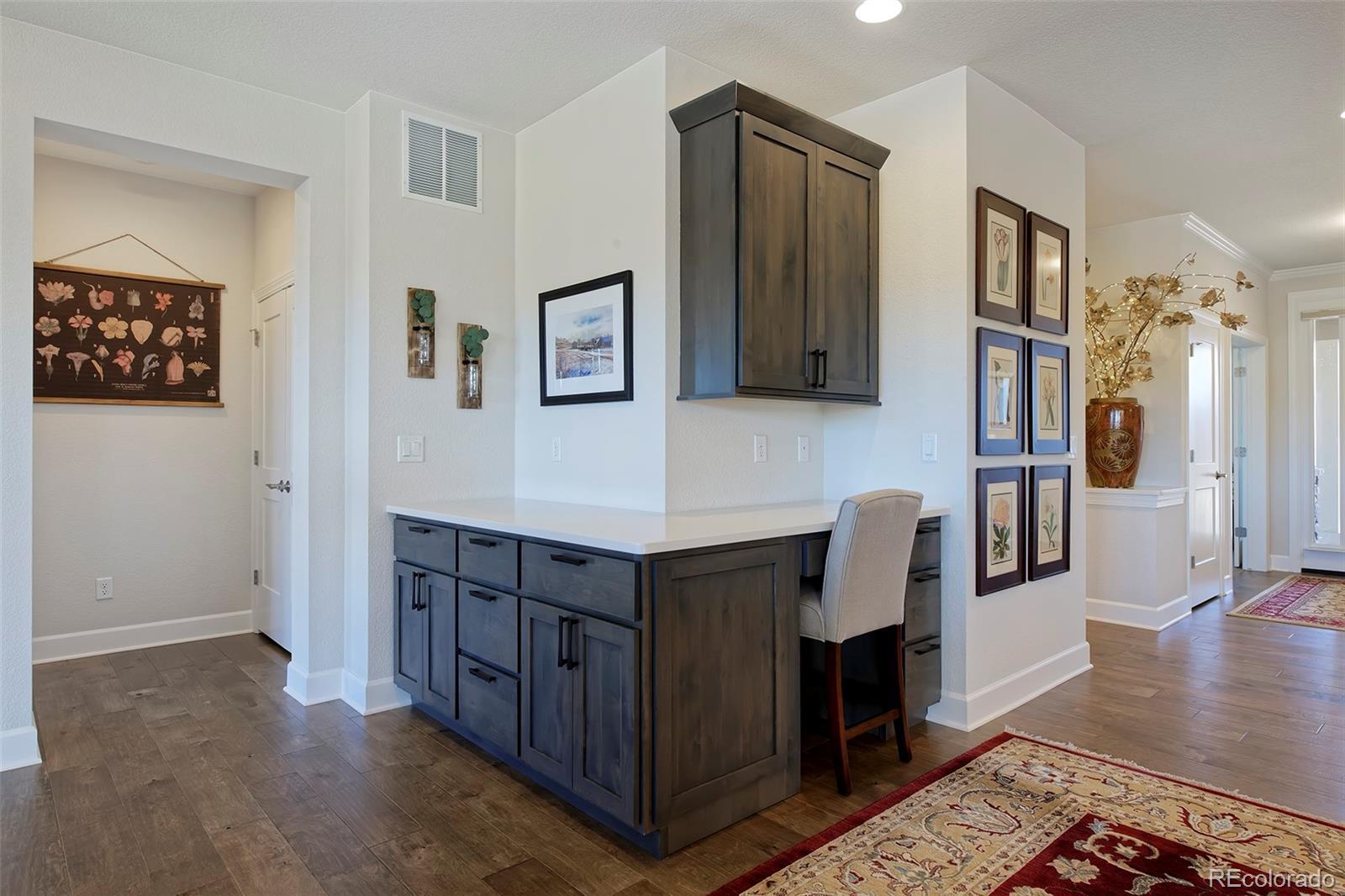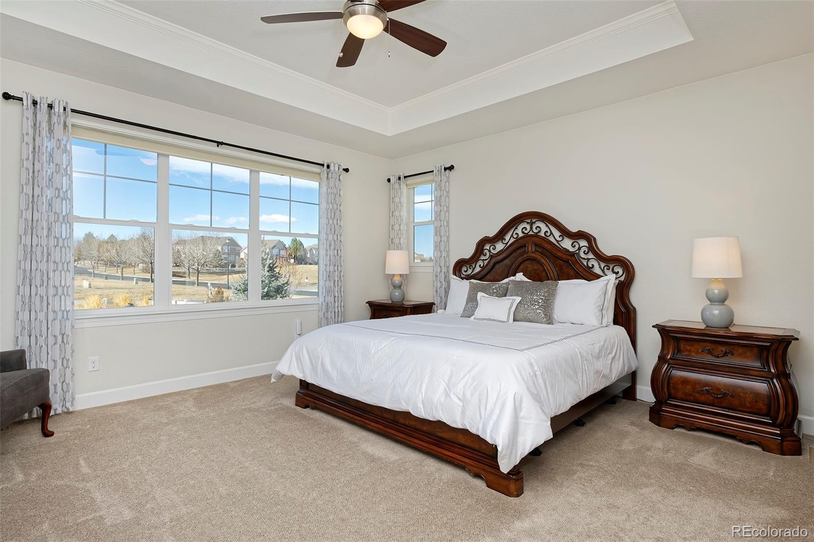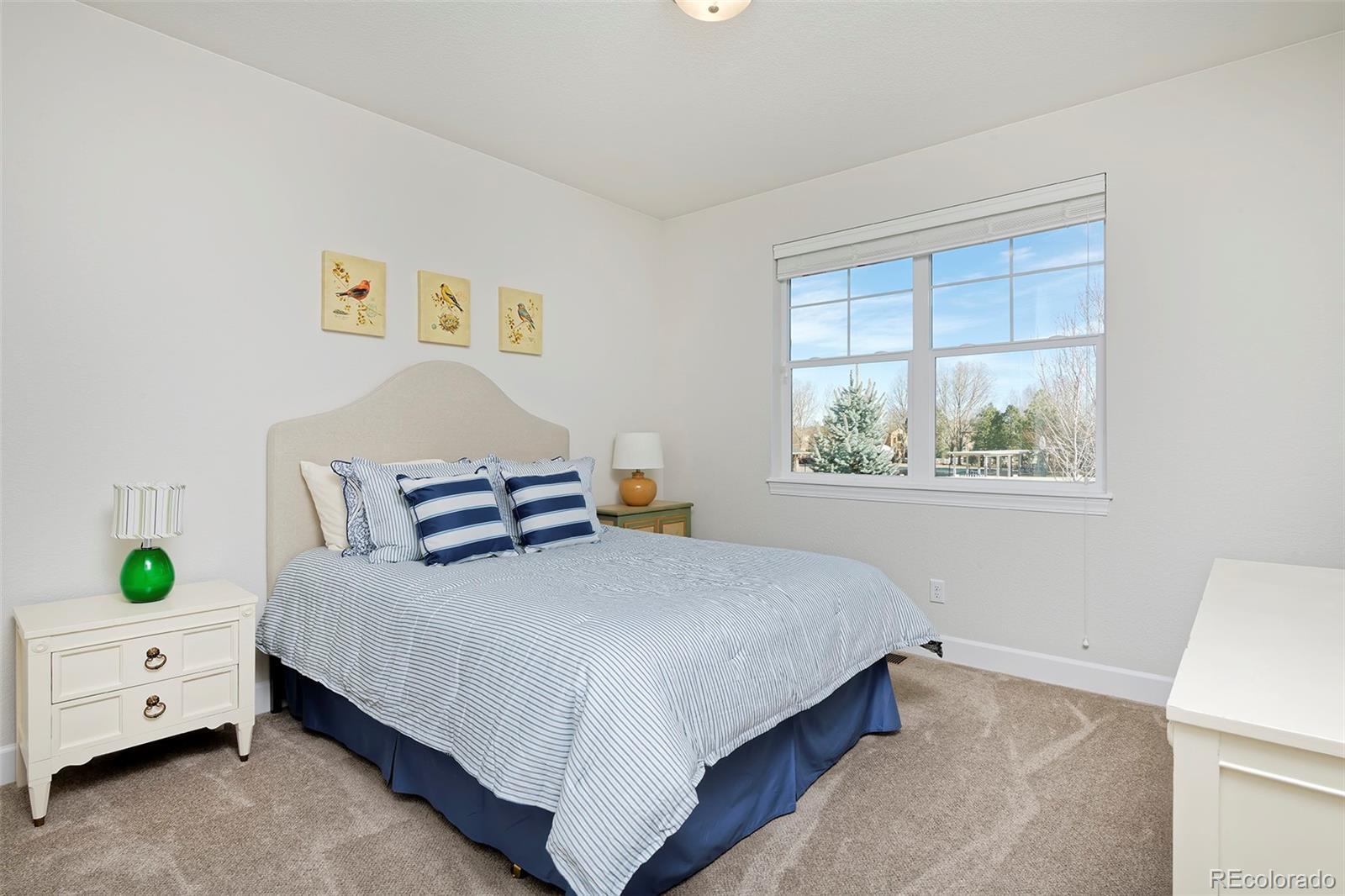 This home is bound to cause a little stomach flip each time you turn the corner and head up your driveway. It's just that perfect. Built in 2018 and immaculate to this day, it backs to Broadlands Golf Course and is moments from the Broomfield Commons open spaces, sports fields and parks. A sweeping, open and bright floor plan is outfitted with beautiful wood floors, custom cabinetry, quartz counters and Bosch appliances while recent upgrades have added a built-in entertainment cabinet in the family room, high-end interior window coverings, and 3 individually controlled climate zones for whole-house comfort. Outside is pristine, lighted landscaping with full irrigation and drip systems; security cameras; a gorgeous patio with sunshades; and a built-in outdoor kitchen and fire pit for wow-worthy entertaining. A 4-car garage with granite epoxy flooring has tons of storage and a workspace with cabinets. This is luxe, single-level living at its best with neighborhood and mountain views to boot.