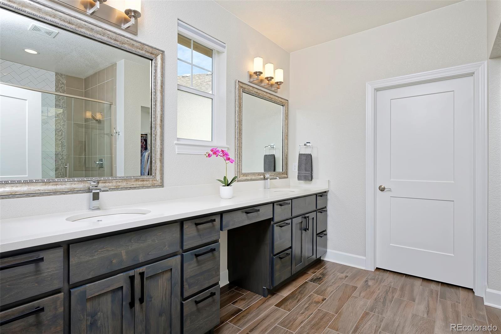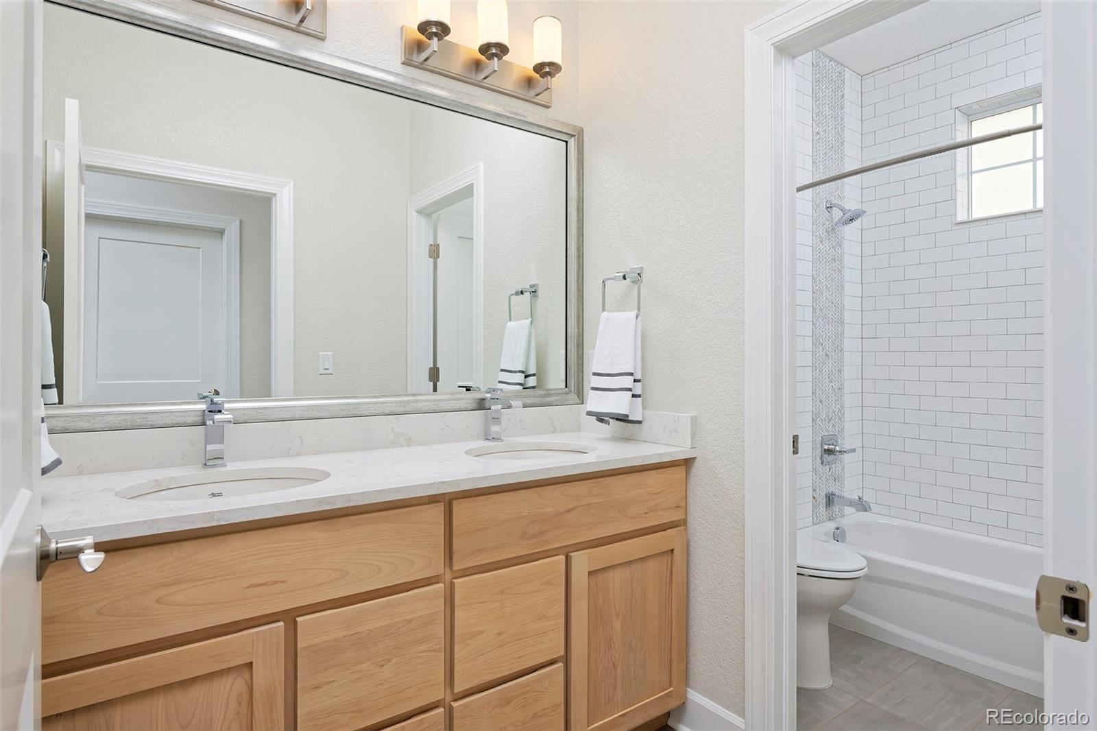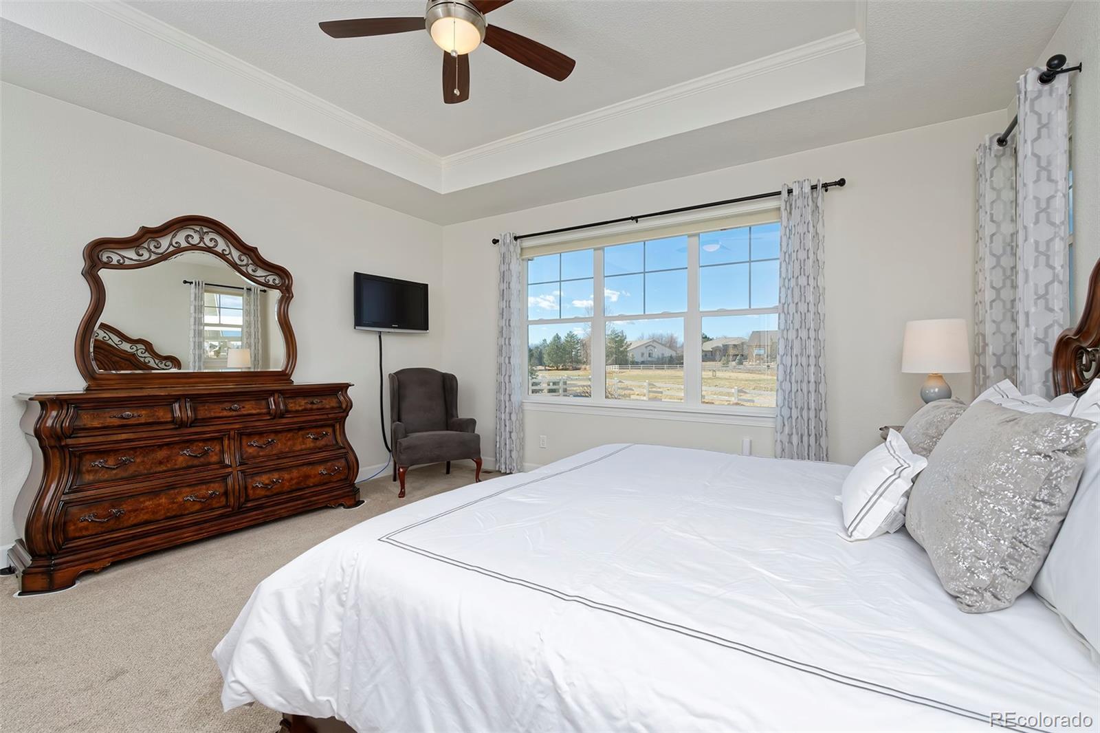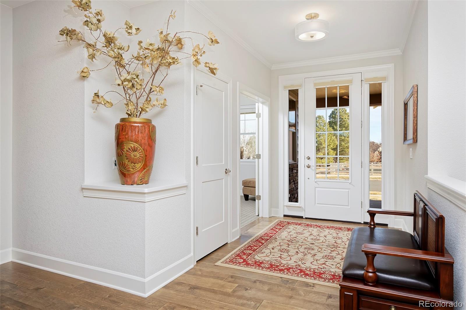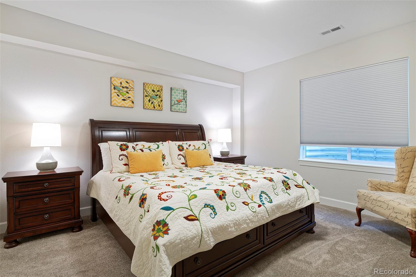 This home is bound to cause a little stomach flip each time you turn the corner and head up your driveway. It's just that perfect. Built in 2018 and immaculate to this day, it backs to Broadlands Golf Course and is moments from the Broomfield Commons open spaces, sports fields and parks. A sweeping, open and bright floor plan is outfitted with beautiful wood floors, custom cabinetry, quartz counters and Bosch appliances while recent upgrades have added a built-in entertainment cabinet in the family room, high-end interior window coverings, and 3 individually controlled climate zones for whole-house comfort. Outside is pristine, lighted landscaping with full irrigation and drip systems; security cameras; a gorgeous patio with sunshades; and a built-in outdoor kitchen and fire pit for wow-worthy entertaining. A 4-car garage with granite epoxy flooring has tons of storage and a workspace with cabinets. This is luxe, single-level living at its best with neighborhood and mountain views to boot.